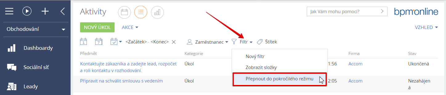 Pokud potřebujete použít komplikovanější filtr, který by mohl obsahovat více parametrů vyhledávání a podmínek, použijte pokročilý filtr. Můžete jej použít například v sekci [Aktivity] pro zobrazení všech schůzek týkajících se nových zákazníků.